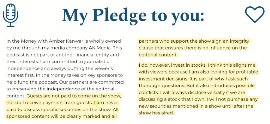 In a "pledge" posted on her website, Amber says: "I will always disclose verbally if we are discussing a stock that I own."
