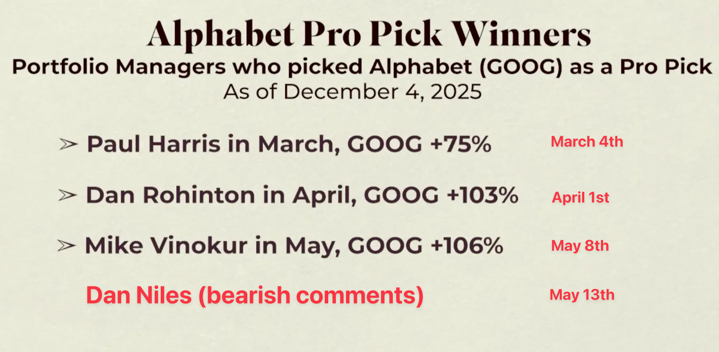 I copy a slide from Amber's year-end show that mentions the 3 instances in 2025 when Alphabet was profiled as a "Pro Pick". I have annotated this slide in red with the dates these shows aired and the date Dan Niles made bearish comments on the stock. Dan Niles came after the three pro-Google guests. We can therefore conclude that Amber's show recommended Alphabet as a top pick on 3 occasions, while she was a shareholder.