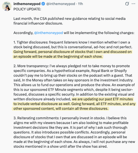 One very basic aspect of finfluencer compliance (in Canada) is that anyone can provide stock-picking advice provided it is not tailored to the needs of a specific investor - in which case, no license needed. However, there's a twist: you have to disclose any financial interest in the security you recommend. (I am simplifying things a bit.) In Ontario, this is all codified in section 34 of the Ontario Securities Act. Although the "finfluencer" guidance is new, section 34 has been on the books for decades.