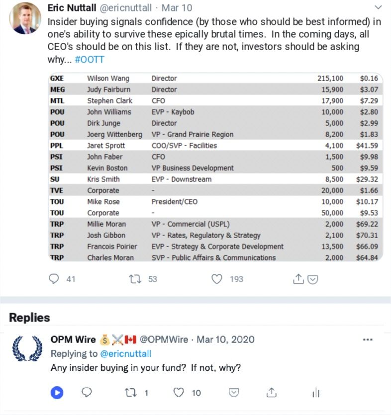 So Nuttall made nice coin when Sprott went public - the figure I hear is $10 million. I am told he has a nice home worth a few million that he’s renovating. And those extreme cut-away collar shirts he favors can’t be cheap. I know they don’t offer them at Uniqlo. People are pointing at the unfairness of this situation. A few weeks ago, in response to him talking about insider buying in energy stocks, I asked him on Twitter how much of his own fund he was insider buying. This was our exchange: