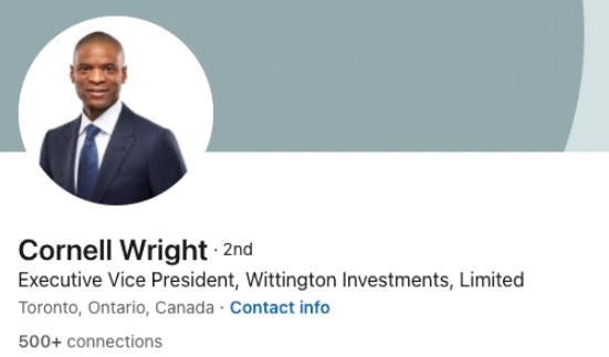 Even their French private chef is on LinkedIn, that's real fancy. The burden of investing the proceeds during these heady times in the market will fall upon Cornell Wright, who assumed the role of President at Wittington this year. Cornell was a partner at Torys and co-head of their M&A practice before joining Wittington in 2021. He did major transactional work for both the Thomsons and the Westons as a lawyer. He is also a director of BCE. Cornell, as the saying goes, happens to be Black. If you’re wondering: does he know Wes Hall, that’s very gauche of you. But the answer is yes, they collaborated on the latter’s BlackNorth Initiative, to boost ethnic diversity in the upper echelons of corporate Canada.