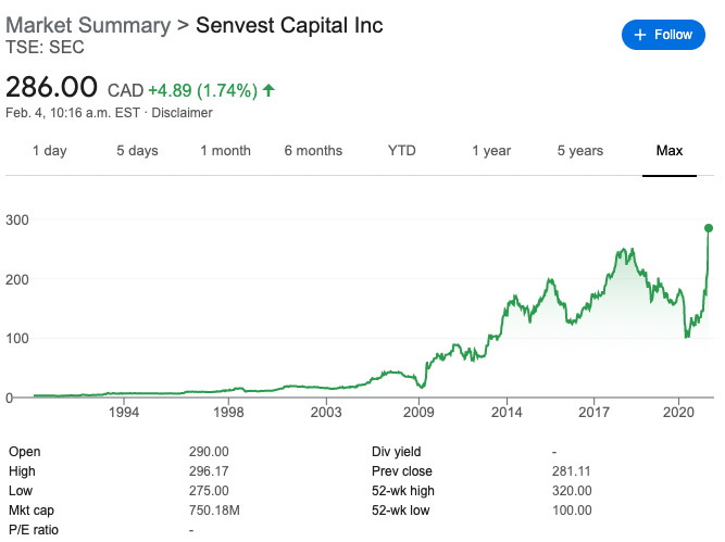 The hedge fund is high-octane, highly opportunistic and volatile. But the overall track record since the 90s has hovered near 20% annualized. Including the GameStop gain, the fund was up 38% in January and is compounding at 18.3% since April 1997, probably making it one of the top performing funds in that period. This comes at the price of steep drawdowns, such as being down 54% in 2008. Senvest on the TSX is up 14x since 2009. Richard Mashaal grew up in Montreal, studied at Wharton and has been based in New York for a long-time. But his Montreal office phone number still works and Senvest, the parent company, is still headquartered here. The Mashaals’ holding in the listed Senvest is now worth around $400m. The hedge fund that had been started with $5m, now runs some $2.4 billion.