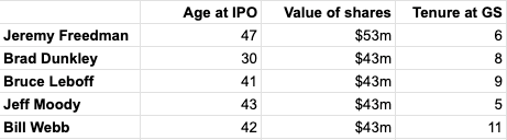Thirty-year old Brad Dunkley had shares worth $43m at IPO. What’s more, his stake was the same as other colleagues with longer tenures at Gluskin and much longer careers in the industry. I summarize all that in the following table: