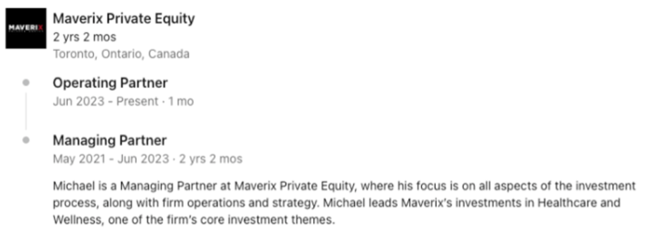 Maverix had a bit of a "bump in the road" in 2023. This news is a few months old, but the third "Managing Partner", who joined Maverix in 2021, has already left. That was Michael Wasserman. (The other Managing Partner Ruffolo recruited, Mark Maybank, is still there.) Wasserman was supposed to have a focus on the healthcare and wellness space. Fortunately, he had retained a role of "Senior Advisor" at his previous employer, the much bigger H.I.G. Capital. He has scrubbed his association with Maverix from LinkedIn, but the Internet never forgets: