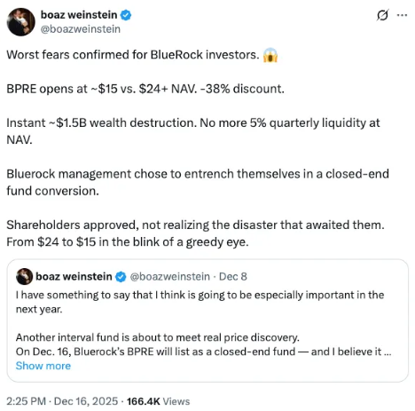 The entire fintwit cognoscenti is abuzz with the outcome of a very interesting experiment in the markets. A private real estate fund recently converted into a public fund and started trading on the NYSE this week. Bluerock Private Real Estate Fund, with assets of US$4.3B, promptly experienced a 40% drop from its last published NAV (from when it was a private fund). From a "private" NAV of $24.36, it's around $15 today. More than 10 million units have traded. One reasonable explanation for such a precipitous fall is that there were a lot of motivated sellers who had been waiting for liquidity. Nevertheless, the judgement of thousands of knowledgeable investors declining to buy at anything close to the "private" NAV is worth taking note of. Here's a related tweet by Boaz Weinstein, who is in the business of buying publicly traded funds at a discount.