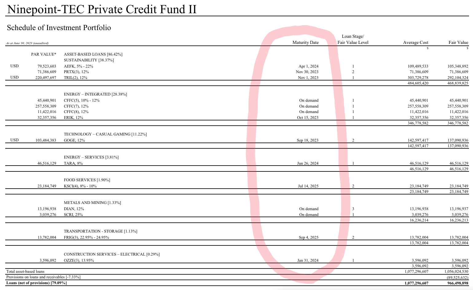 The Ninepoint-TEC Private Credit Fund II had $606 million of loans, at fair value, maturing from the second half of 2023 up to April 2024, according to the fund's interim financial statements as of June 30, 2023— available at the very end of this piece in the appendix.