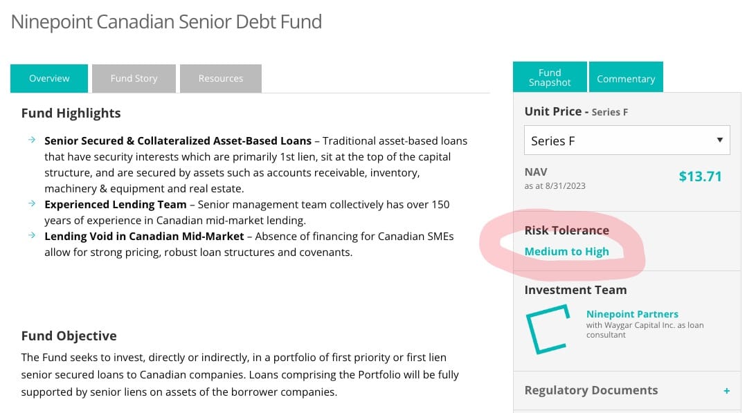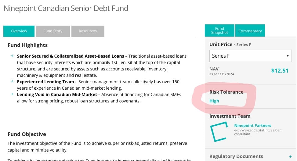 Well, Ninepoint has once again shifted the goalposts. They have changed mid-game the “risk tolerance” label of the fund. As recently as October, 2023, the Ninepoint-Waygar Fund was marketed with a “risk tolerance” of “medium to high.”