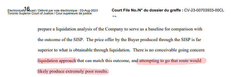 QSG also engaged accounting firm RSM to “prepare a liquidation analysis of [QSG] to serve as a baseline for comparison with the outcome of the SISP.” However, according to QSG, “the price offer by the Buyer produced through the SISP is far superior to what is obtainable through liquidation. There is no conceivable going concern liquidation approach that can match this outcome, and attempting to go that route would likely produce extremely poor results,”