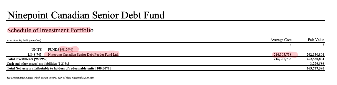 However, the financial statements for the Ninepoint Canadian Senior Debt Fund currently available on Ninepoint’s website provide no visibility into the fund’s portfolio. These financials show only that the fund is invested in the Ninepoint Canadian Senior Debt Master Fund LP, registered in the Cayman Islands,
