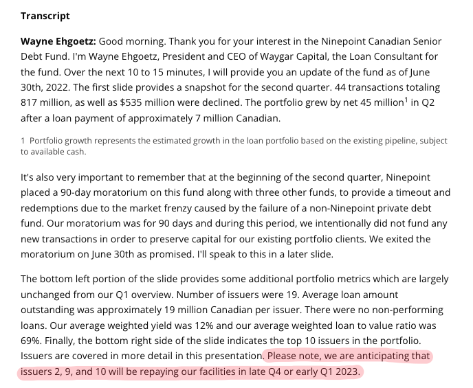 As mentioned, on August 10, 2022, during Ninepoint-Waygar’s fund H1 2022 review, Wayne Ehgoetz told investors that, along with Issuer 10, Issuer 9 “will be repaying our facilities in late Q4 or early Q1 2023.” See the excerpt highlighted in red below.
