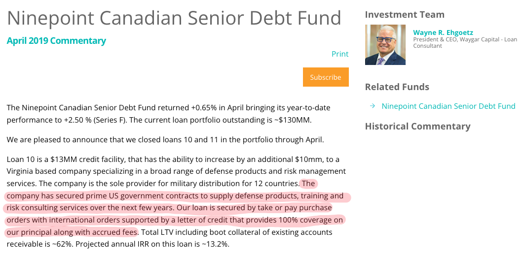 However, Ninepoint provided some ostensibly positive news about Issuer 10. This borrower has a “pipeline of contracts at various stages totalling US$520+ million,” and it “signed an additional tranche of its US$126MM contract last week with a foreign government entity; successfully delivered multiple tranches of the contract.”
