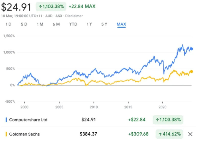 There is universal disdain on the street for "back office" jobs. And yet, Wes Hall took a similar back office job and transformed it into an opportunity to revolutionize an industry and build a 9 figure fortune. While I was working at Scotia, my division was sold to Computershare. That’s an Australian transfer agent consolidator worth $15B. Now, here are the comparative returns of Computershare vs Goldman Sachs going back 25 years. Based on this chart, who are the real financial wizards? There are riches in niches!