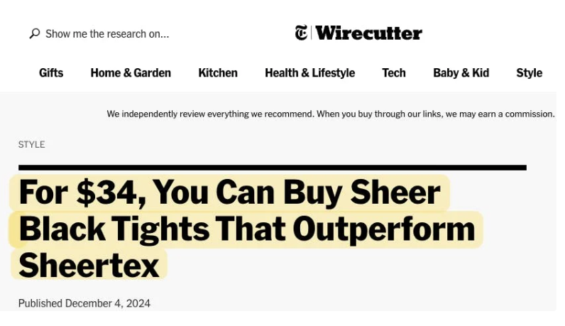 Wirecutter is not infallible, I remember they used to be against air fryers many years ago. For this particular category, I found Good Housekeeping has a much more thorough review involving instruments and multiple testers and they rate Sheertex very highly. Still, it seems like a competitive category, you might say it’s a tight race. There are factors besides durability, such as price and comfort. Sometimes, VCs talk about a “10X” improvement, Sheertex probably doesn’t meet that criteria on a quality / price basis, as best I can tell from cursory research.