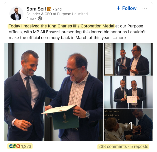 Just a month before the OSC kerfuffle, Som posted on LinkedIn about receiving the King Charles III’s Coronation medal. 1,272 people liked that post and 238 people commented. Among prominent people who wrote congratulatory messages were Miles Nadal, John Ruffolo, investment banker Neil Selfe, lawyer Walied Soliman, VC Boris Wertz, Jordan Banks (former CEO of Facebook Canada), Donald Guloien (former CEO of Manulife), Mark Maybank (co-founder of Ruffolo’s Maverix Private Equity), Shaun Hauser (CEO of Wellington-Altus), Richard Abboud (Founder of Forum Asset Management), Michael Serbinis (celebrity entrepreneur), David Ossip and Rupert Duchesne.