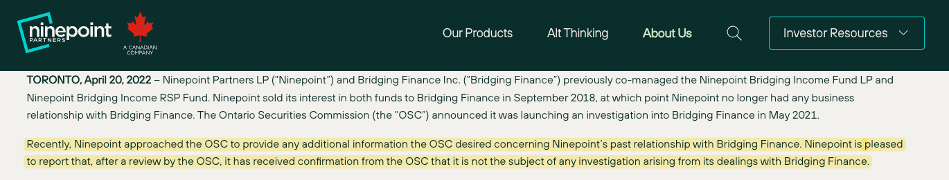 Ninepoint was co-manager along with Bridging Finance at a time when major fraud was brewing. They were either complicit, willfully blind or incompetent. Walied's "diligence" is probably not worth much.