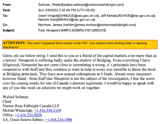 In this post, I will show an intriguing email by celebrity corporate lawyer Walied Soliman to then OSC Chair Grant Vingoe (and others) on behalf of Ninepoint Partners. In this email, Walied is pleading for the OSC to tell everyone that Ninepoint did nothing wrong that contributed to the collapse of Bridging Finance.