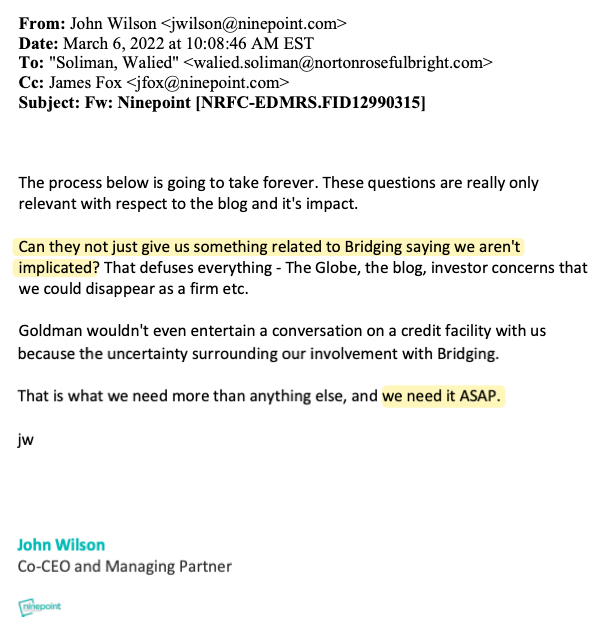 John Wilson's request is that the OSC needs to exculpate Ninepoint pronto in respect of its conduct as Bridging Finance's former BFF. He says the "process below", likely meaning, the lower-level interactions with the OSC, is going to "take forever." References to "the blog" are references to OPM Wire - Ninepoint complained many times that this blog was a key reason behind advisors fleeing their funds.