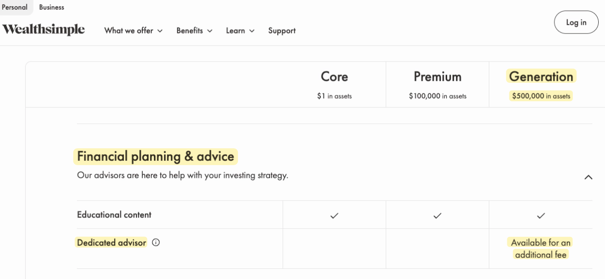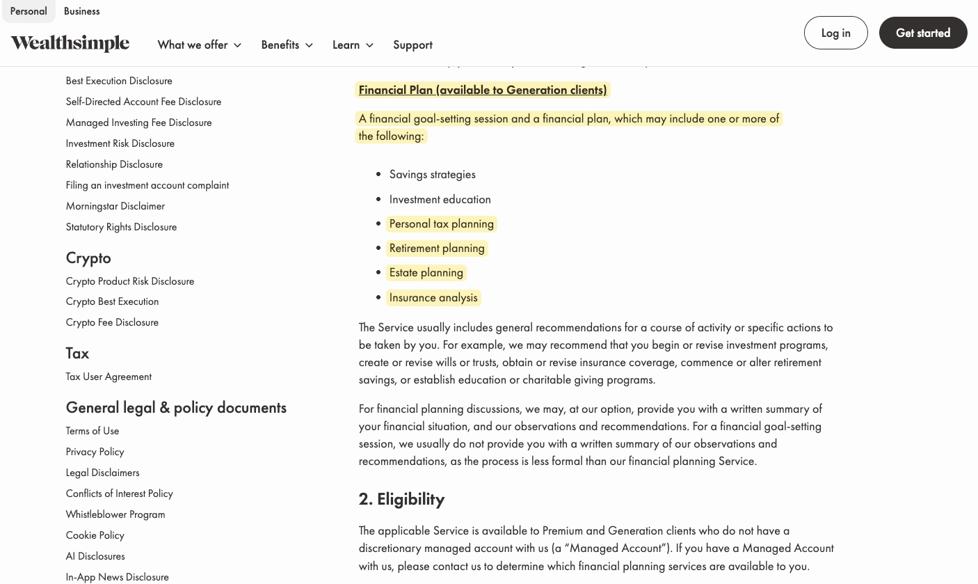 Wealthsimple specifically advertizes personalized financial planning from a dedicated advisor as a perk for "Generation" clients (ie. those having more than $500k). Clients pay an extra fee for this, starting at 0.4% for clients with portfolios under $1m. Under contract law, an unlawful provision (such as providing unlicensed financial planning) may void the agreement in whole or in part.