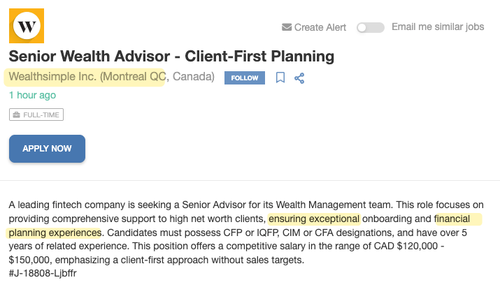 As I have myself never experienced the wonders of Wealthsimple’s wealth management, I do not know if they have actually done financial planning for Quebec clients. But that seems likely from the lack of any Quebec carve-out language in their legal terms. Here they are recruiting for someone to offer "financial planning experiences" in Montreal.