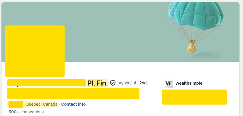 Here's one "wealth management leader" at Wealthsimple, who uses the protected "Pl. Fin." title (the French abbreviation of financial planner) without holding the appropriate certificate from the Quebec regulator. That by itself is an offence.